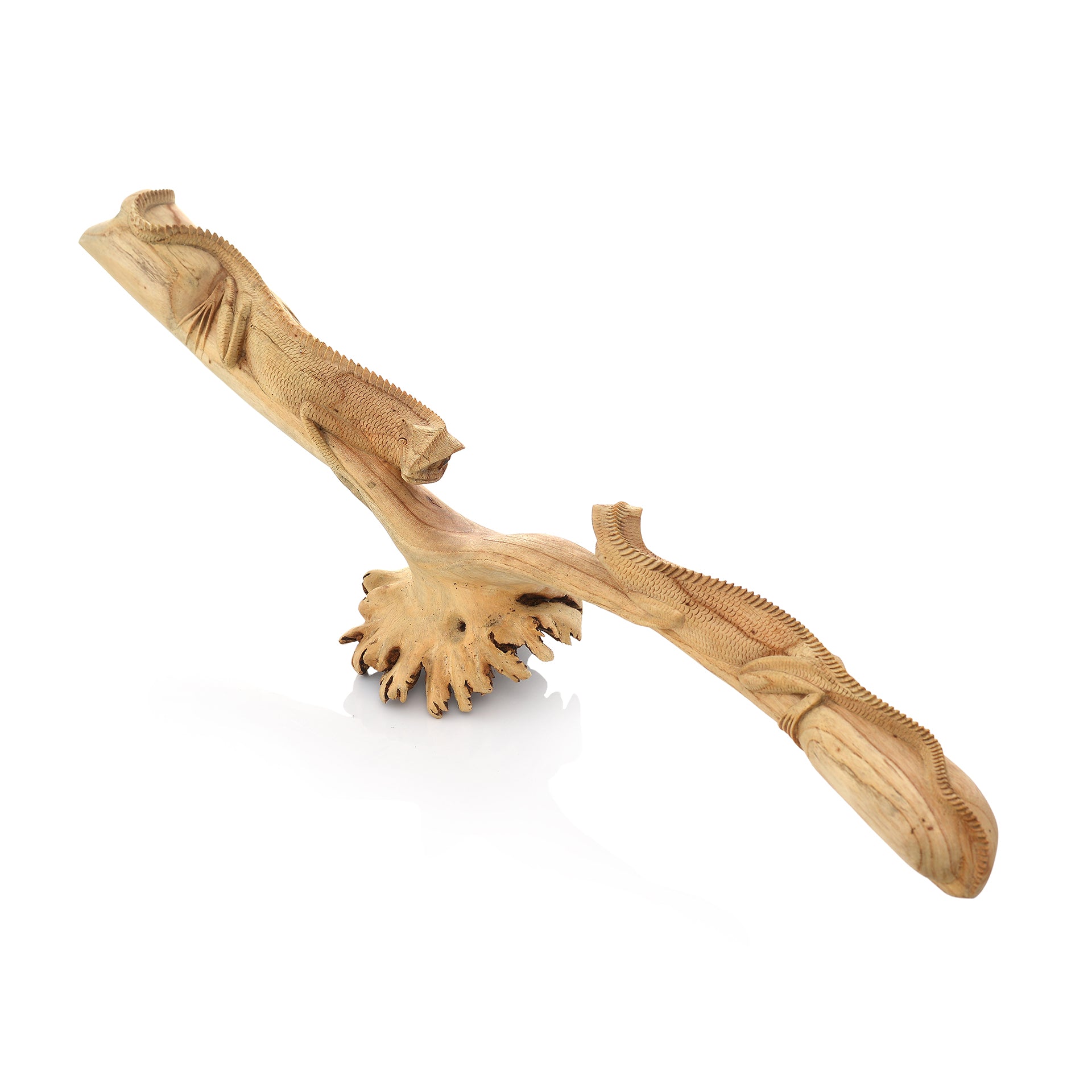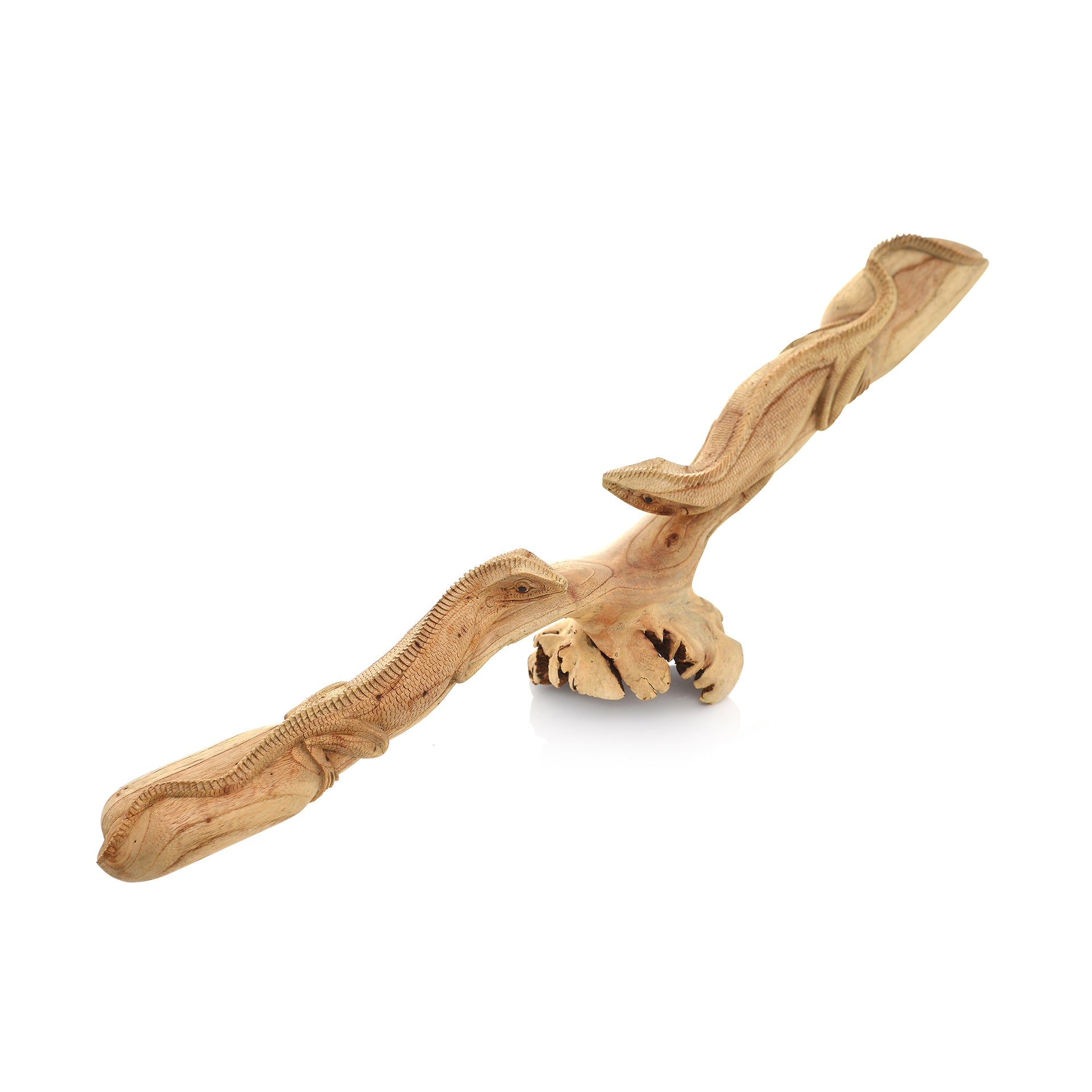 Dieses faszinierende Figur aus zwei handgeschnitzten Echsen auf einem Baumast ist ein wahres Kunstwerk. Die Figur ist aus einem einzigen Stück Holz geschnitzt, was ihre außergewöhnliche Handwerkskunst und die natürliche Schönheit des Materials unterstreicht. Mit einer Länge von 56 cm, einer Breite von 10 cm und einer Höhe von 15 cm ist dieses Unikat eine imposante Präsenz.