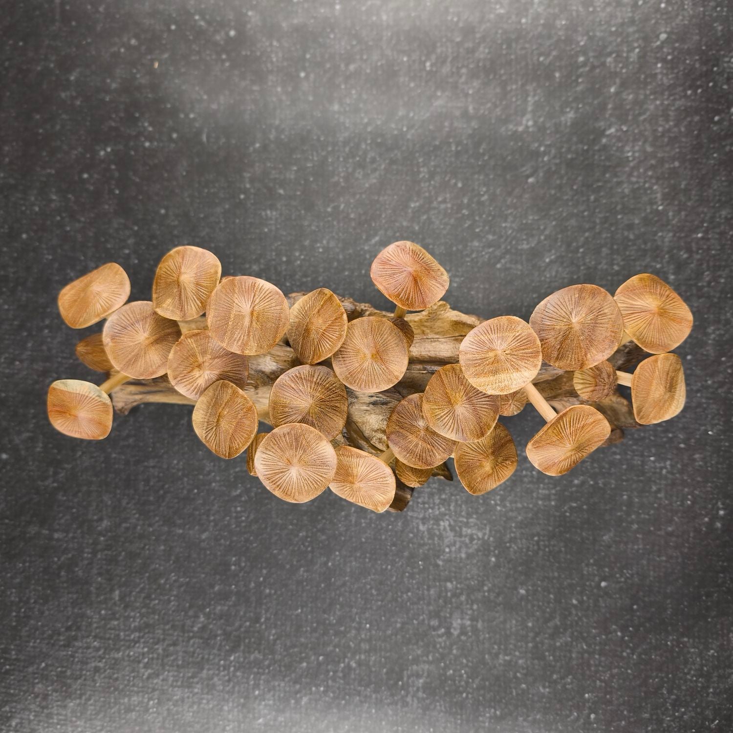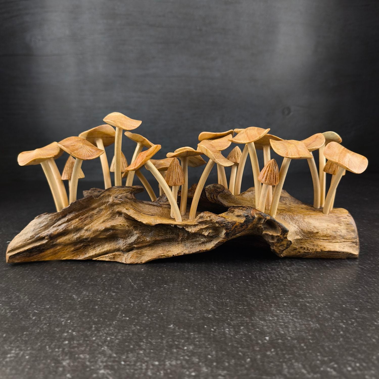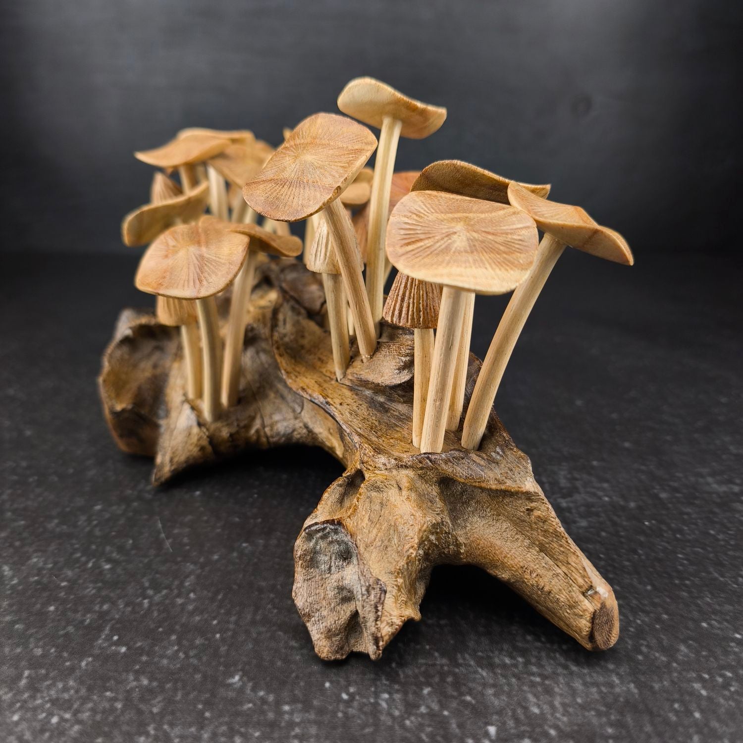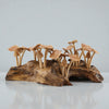 Die Pilze stehen auf einem massiven Wurzelholz-Sockel, der mit seiner natürlichen Struktur jedes Set zu einem unverwechselbaren Unikat macht.