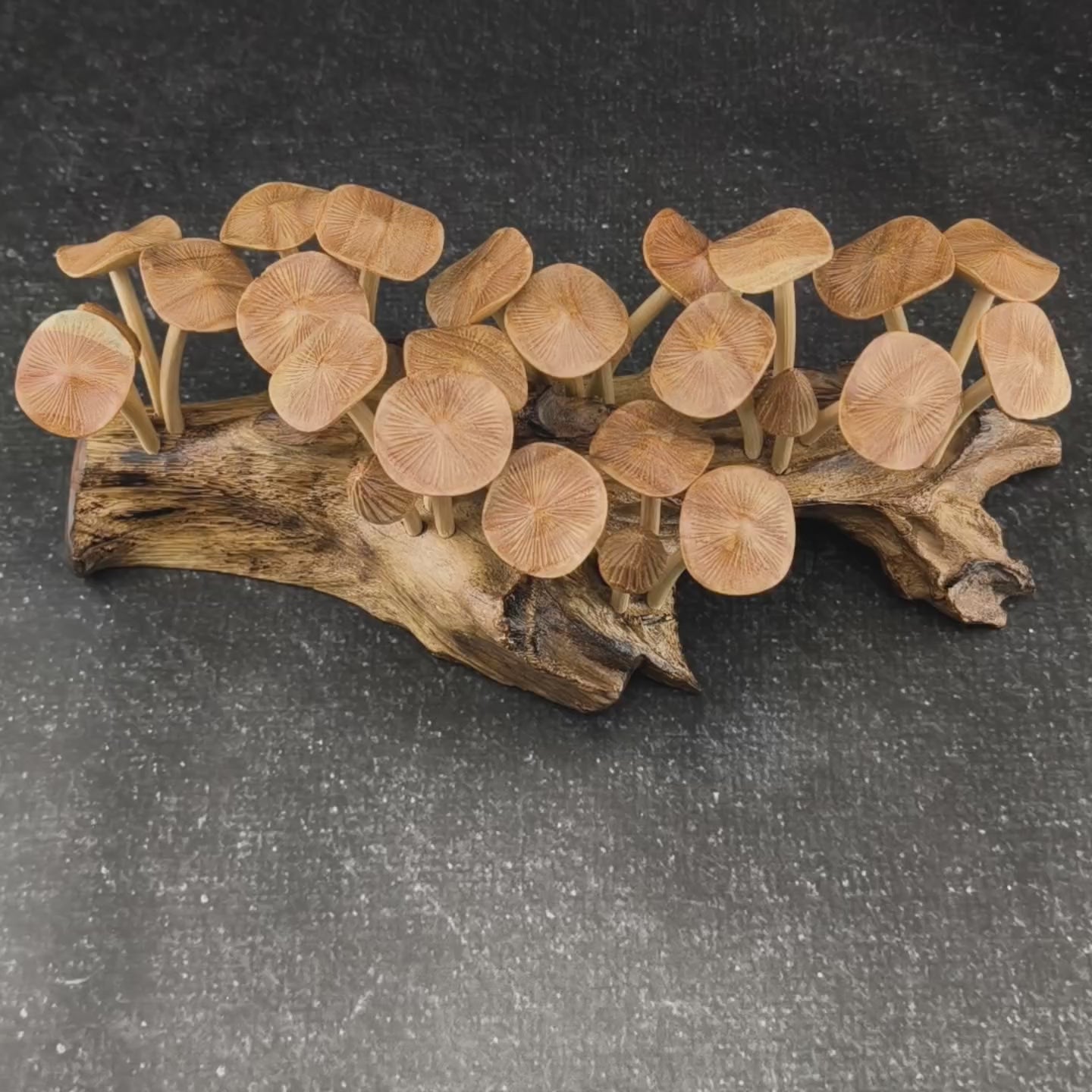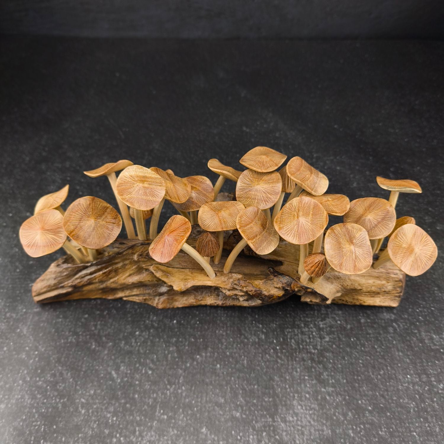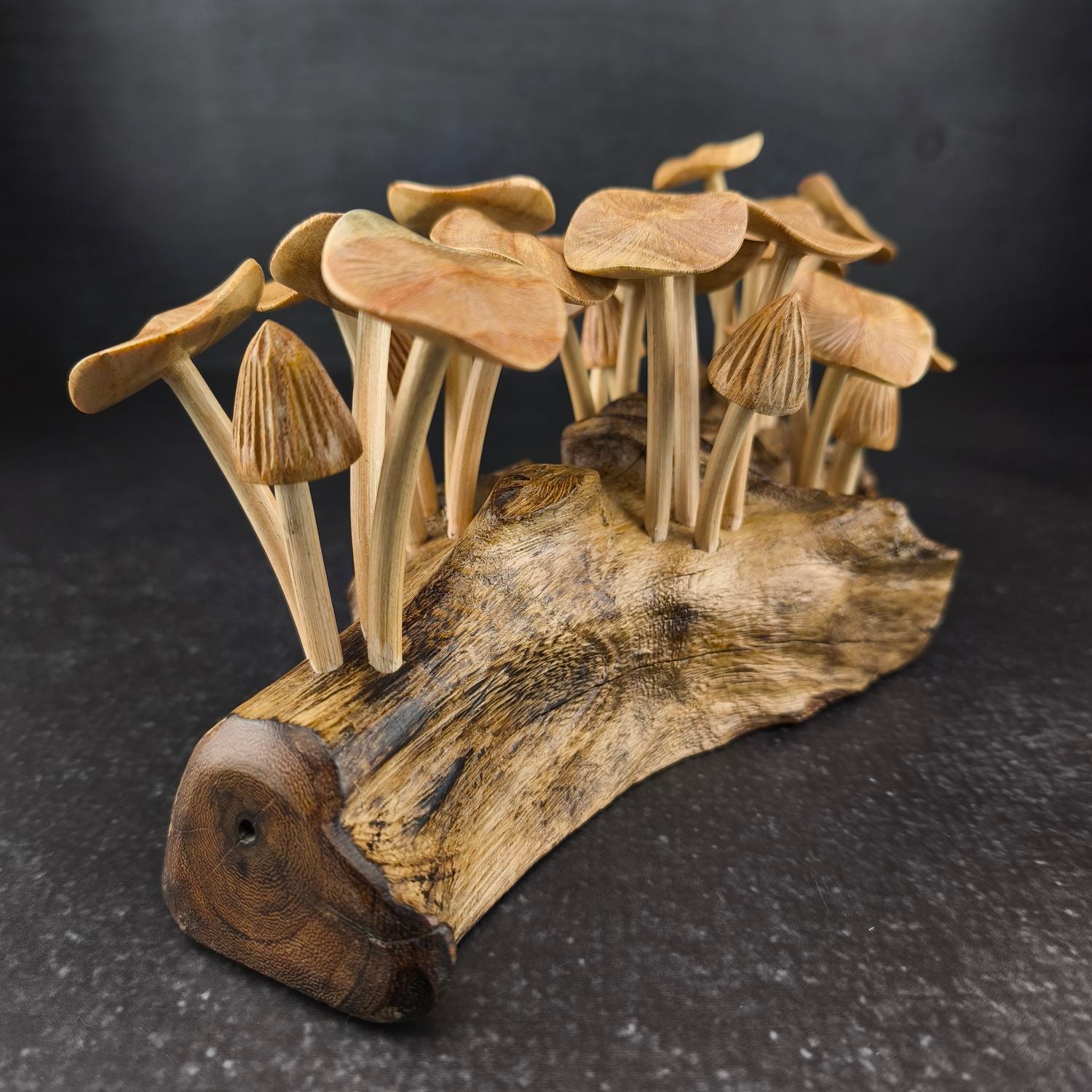 Die Pilze stehen auf einem massiven Wurzelholz-Sockel, der mit seiner natürlichen Struktur jedes Set zu einem unverwechselbaren Unikat macht.