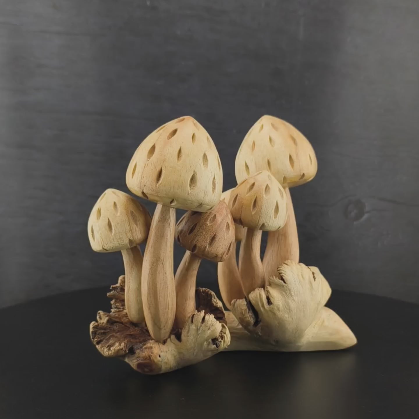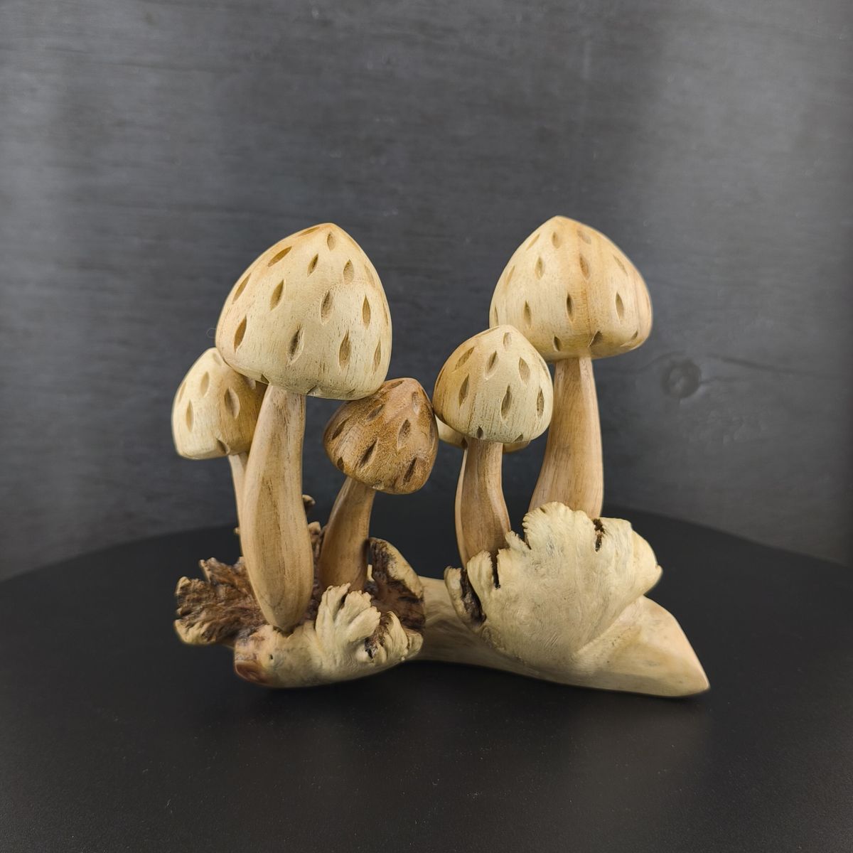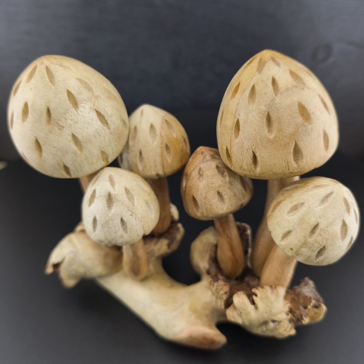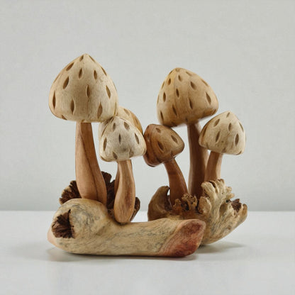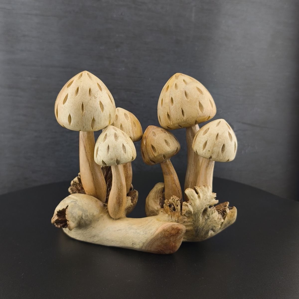 Die 6 handgeschnitzten Fliegenpilze aus edlem Jempinisholz stehen auf einem rustikalen Wurzelholz-Sockel – jedes Stück ist ein Unikat.
