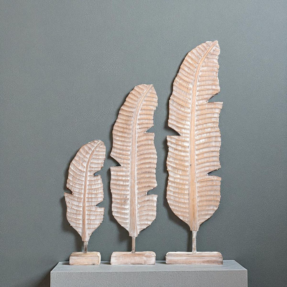 Verleihe deinem Zuhause einen Hauch von Natur und Vintage-Charme mit diesem Set aus 3 handgefertigten Bananenblättern aus Mango-Holz.