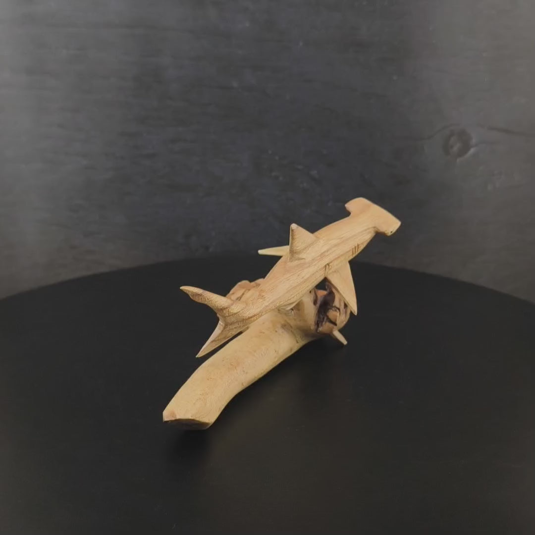 Bring maritime Deko in dein Zuhause: Dieser handgeschnitzte Hammerhai aus Holz wird aus edlem Jempinis-Holz gefertigt, ist ca. 15 cm lang und steht auf einem Sockel aus Parasitholz.