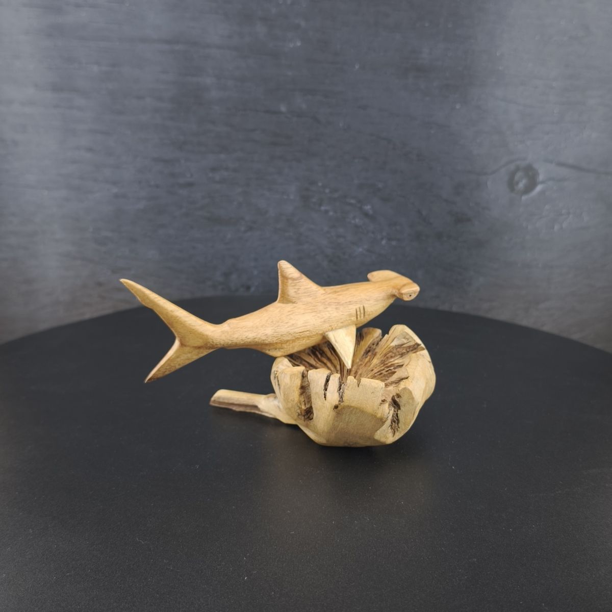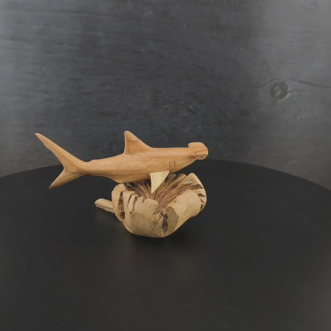 Bring maritime Deko in dein Zuhause: Dieser handgeschnitzte Hammerhai aus Holz wird aus edlem Jempinis-Holz gefertigt, ist ca. 15 cm lang und steht auf einem Sockel aus Parasitholz.