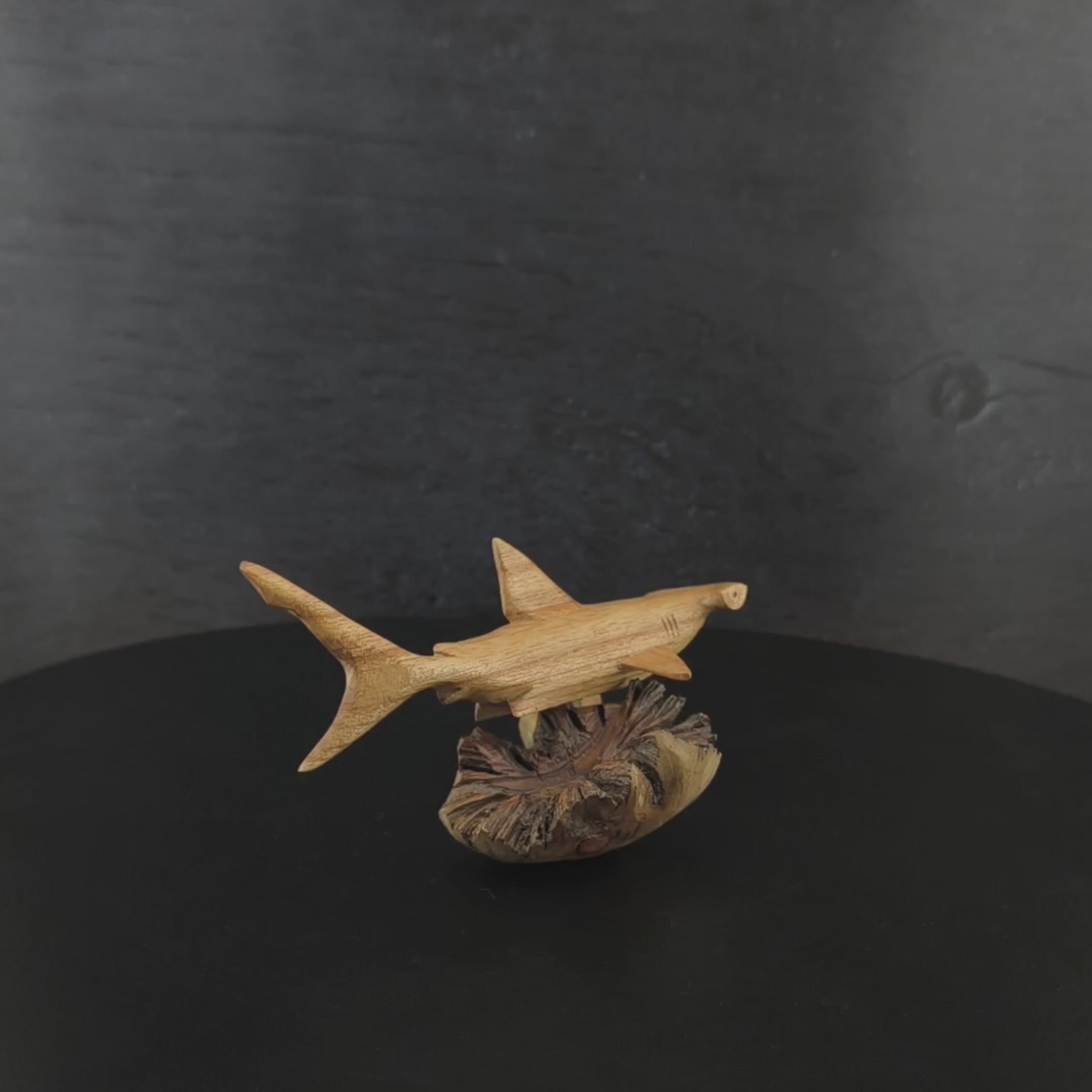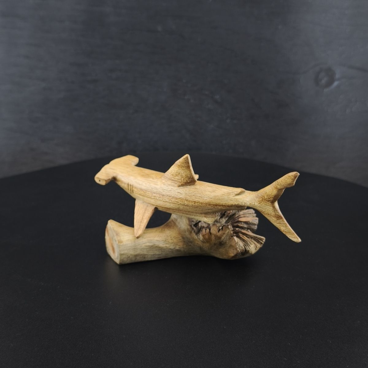 Dieser handgeschnitzte Hammerhai aus Holz wird aus edlem Jempinis-Holz gefertigt, ist ca. 15 cm lang, 7 cm breit und steht auf einem Sockel aus Parasitholz.