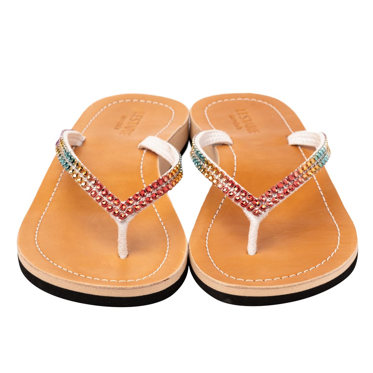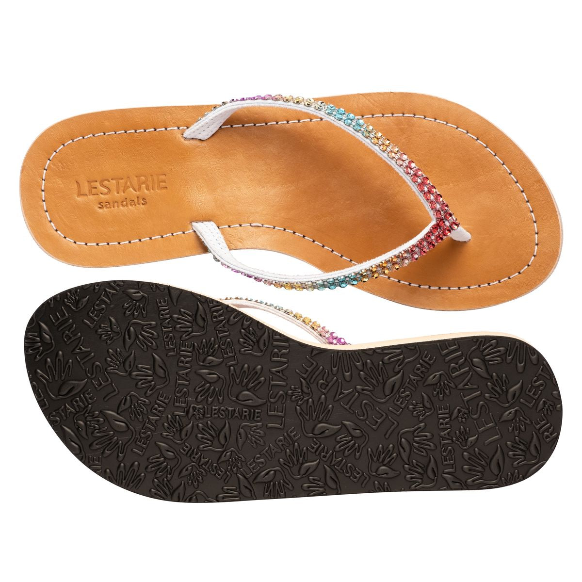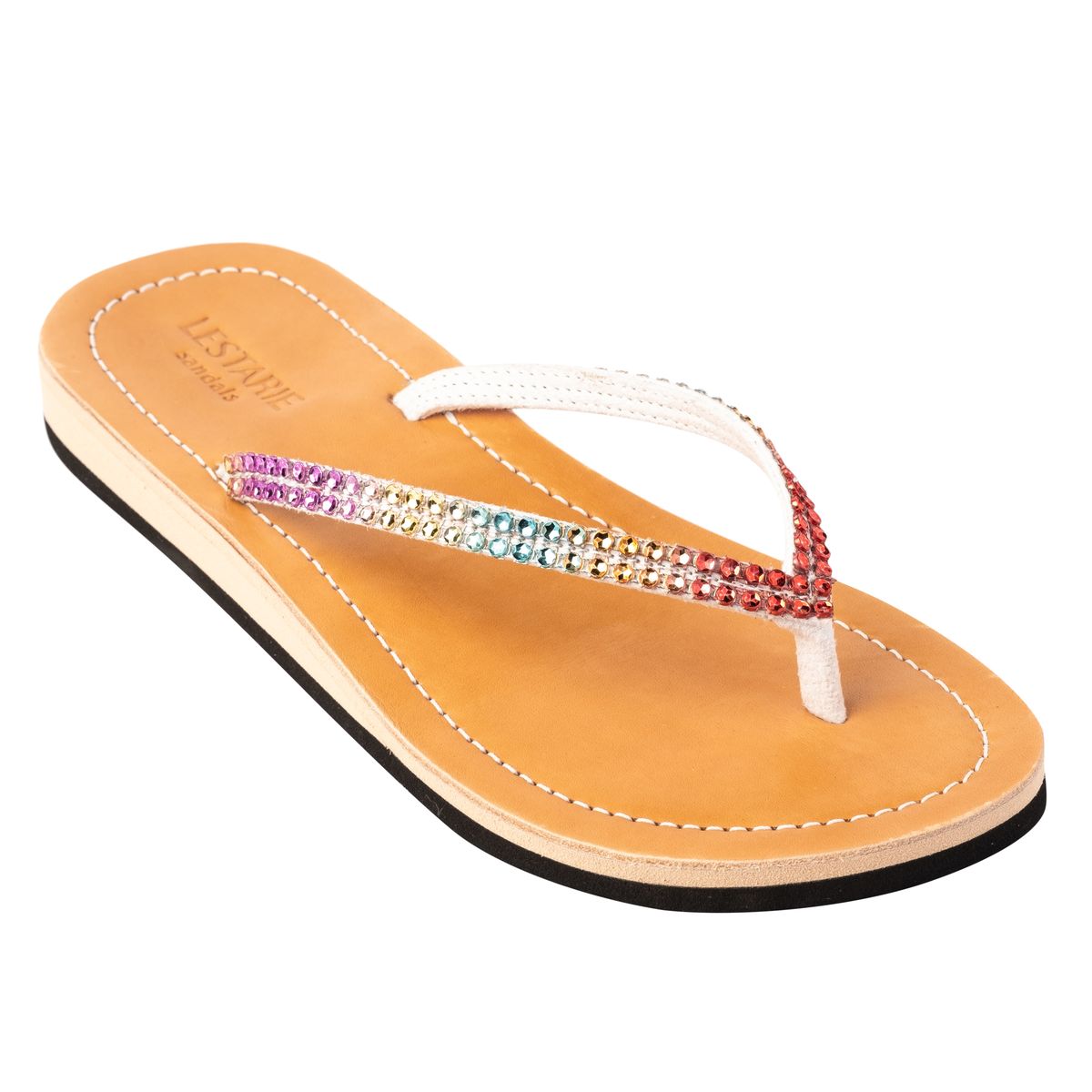 Ein besonderes Highlight sind die filigranen Riemchen, die mit funkelnden Strasssteinchen in Regenbogenfarben verziert sind. Sie verleihen der Sandale einen einzigartigen Look und setzen glänzende Akzente bei jedem Schritt.