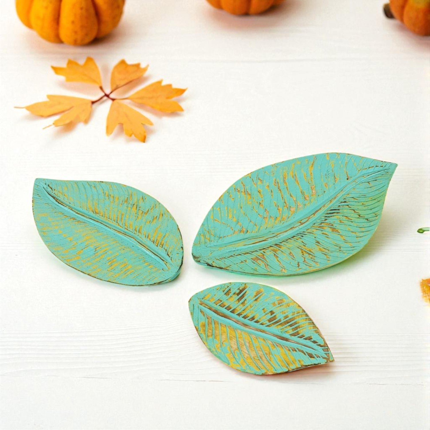 Bringe natürliche Eleganz in dein Zuhause – mit diesem Set aus 3 handgefertigten Holzschalen im Blattmotiv.