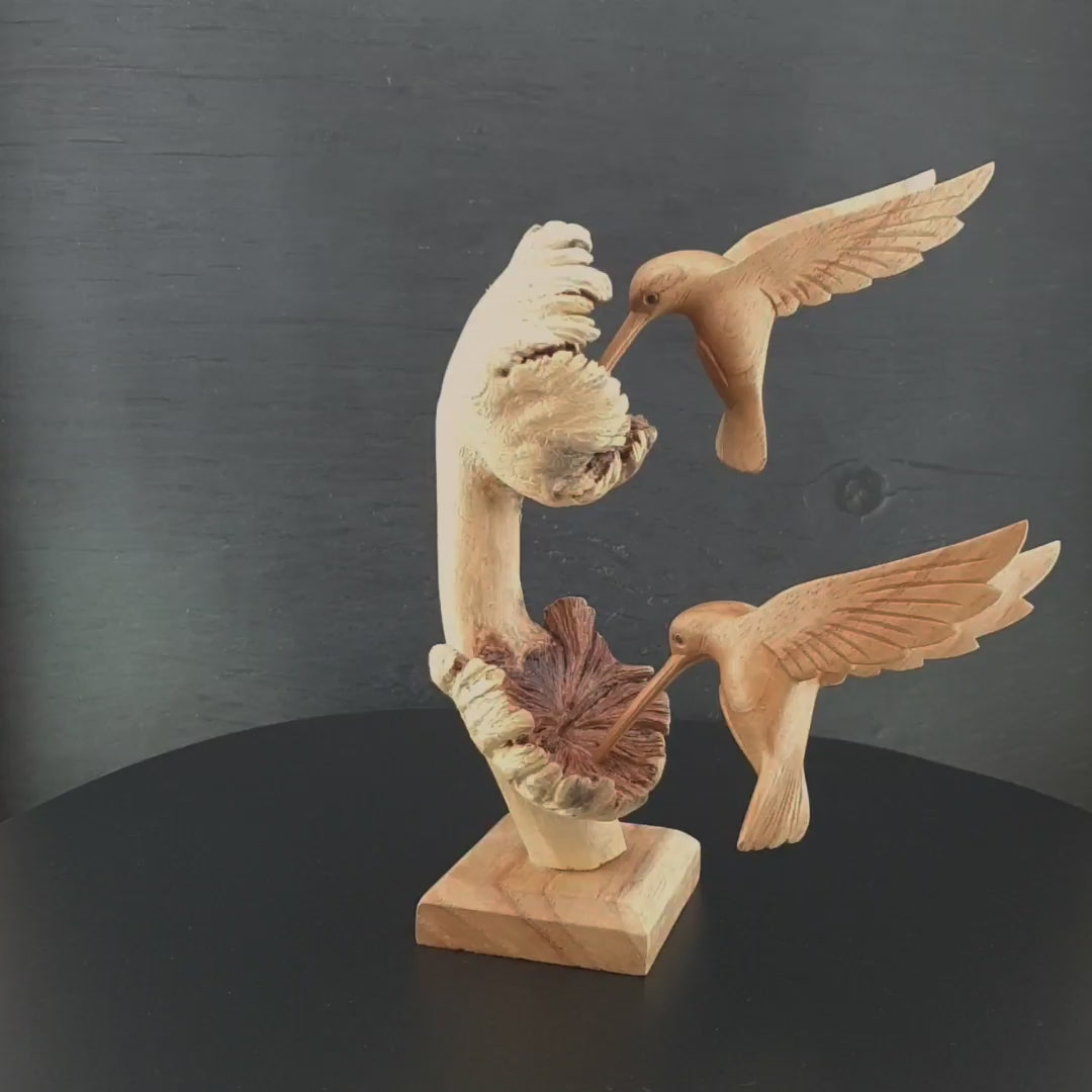 Mit einer Höhe von 22 cm und einer Breite von 16 cm setzt die Figur elegante Akzente in jedem Raum. Die detailreich geschnitzten Kolibris (je ca. 15 cm lang, 4 cm breit) zeigen eindrucksvolle Holzschnitzerei und betonen die warme, natürliche Holzmaserung.