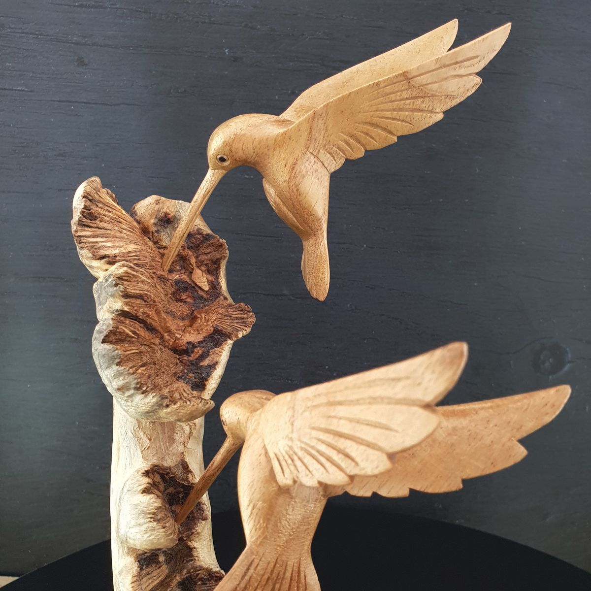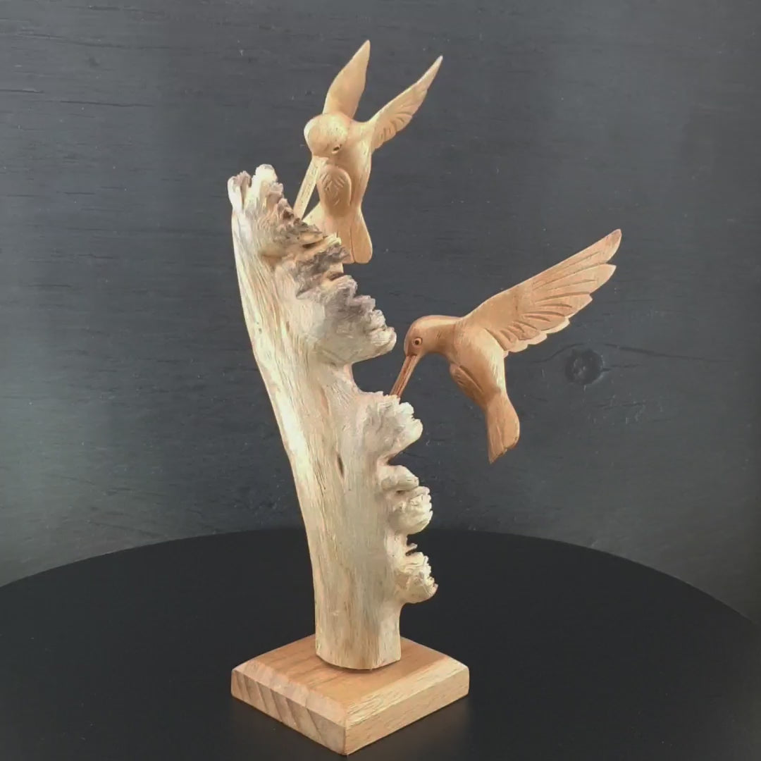 Mit einer Höhe von 27 cm und einer Breite von 16 cm setzt die Figur elegante Akzente in jedem Raum. Die detailreich geschnitzten Kolibris (je ca. 15 cm lang, 4 cm breit) zeigen eindrucksvolle Holzschnitzerei und betonen die warme, natürliche Holzmaserung.