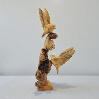 Bringe natürliche Eleganz in Dein Zuhause! Diese zwei handgeschnitzten Kanarienvögel aus edlem Jempinis-Holz sitzen auf einem Sokel aus Parasitenholz – jedes Stück ist ein echtes Unikat.
