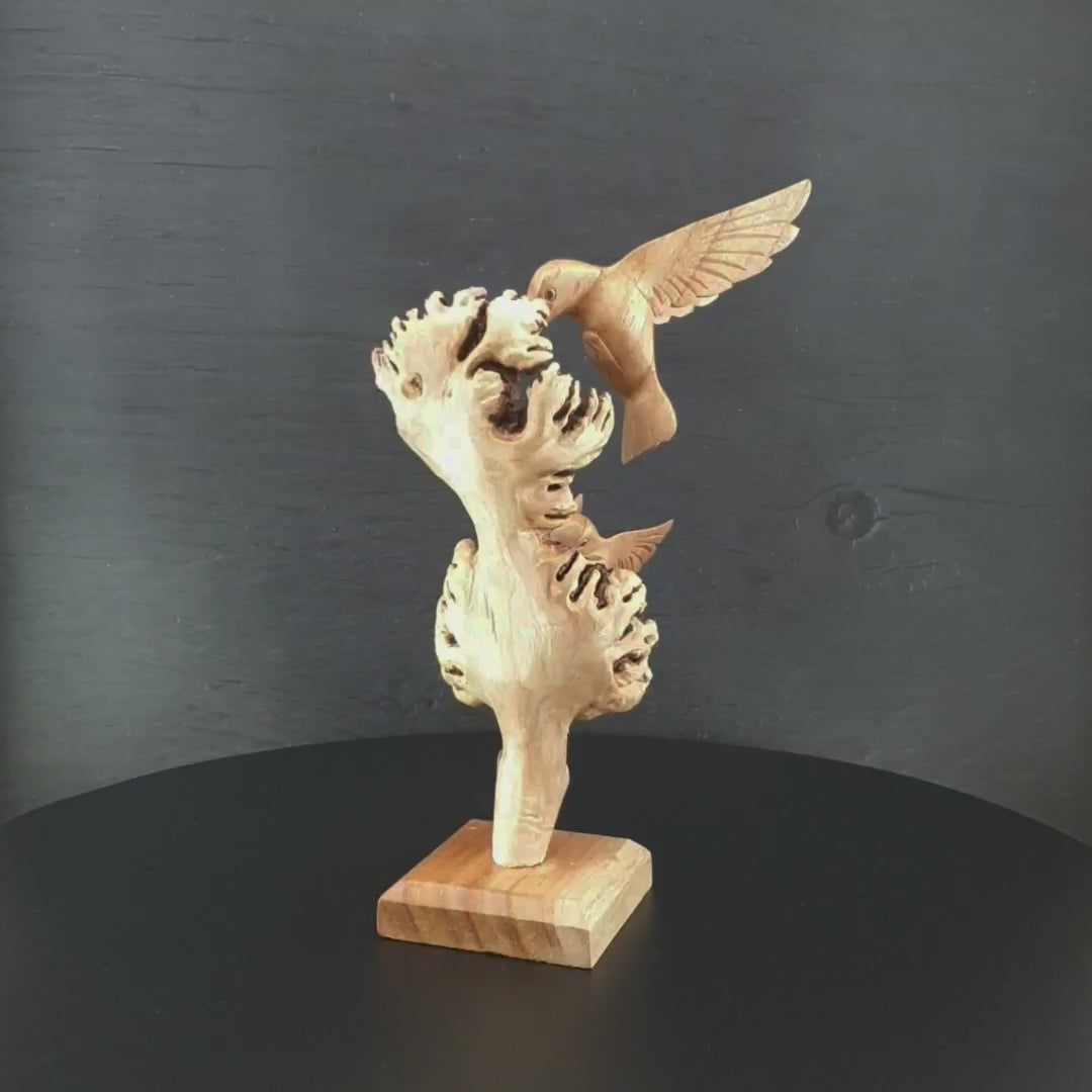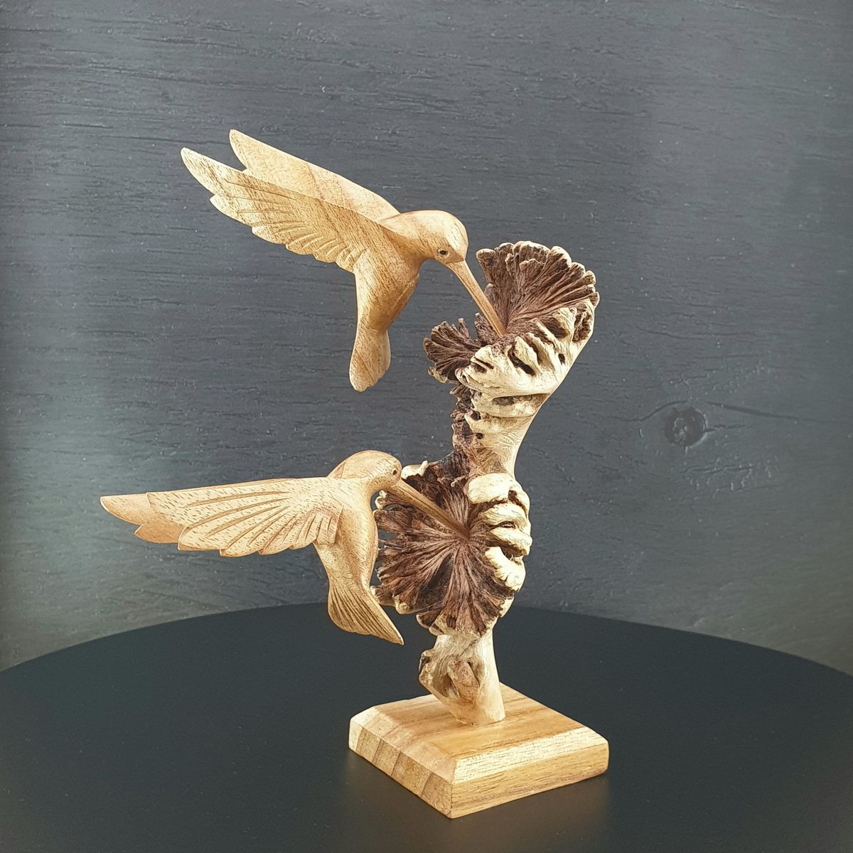 Mit einer Höhe von 23 cm und einer Breite von 19 cm setzt die Figur elegante Akzente in jedem Raum. Die detailreich geschnitzten Kolibris (je ca. 15 cm lang, 4 cm breit) zeigen eindrucksvolle Holzschnitzerei und betonen die warme, natürliche Holzmaserung.