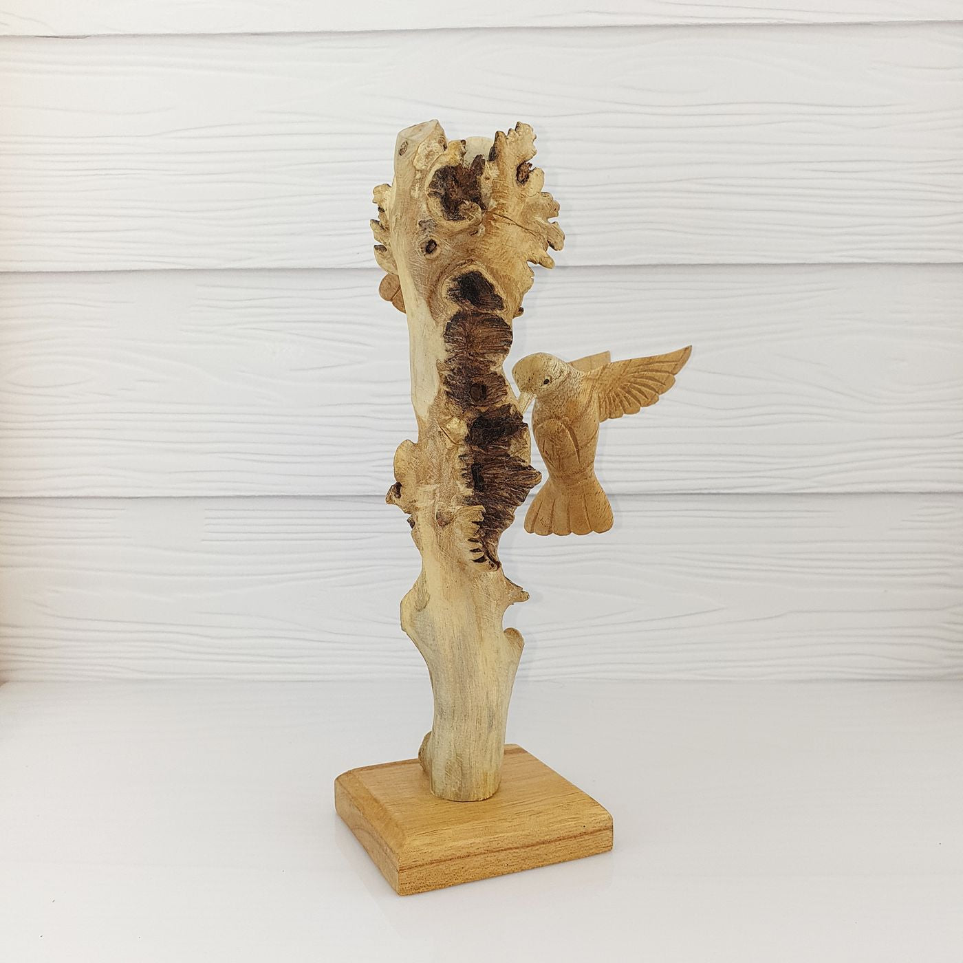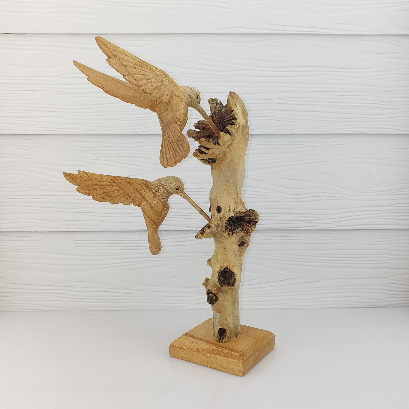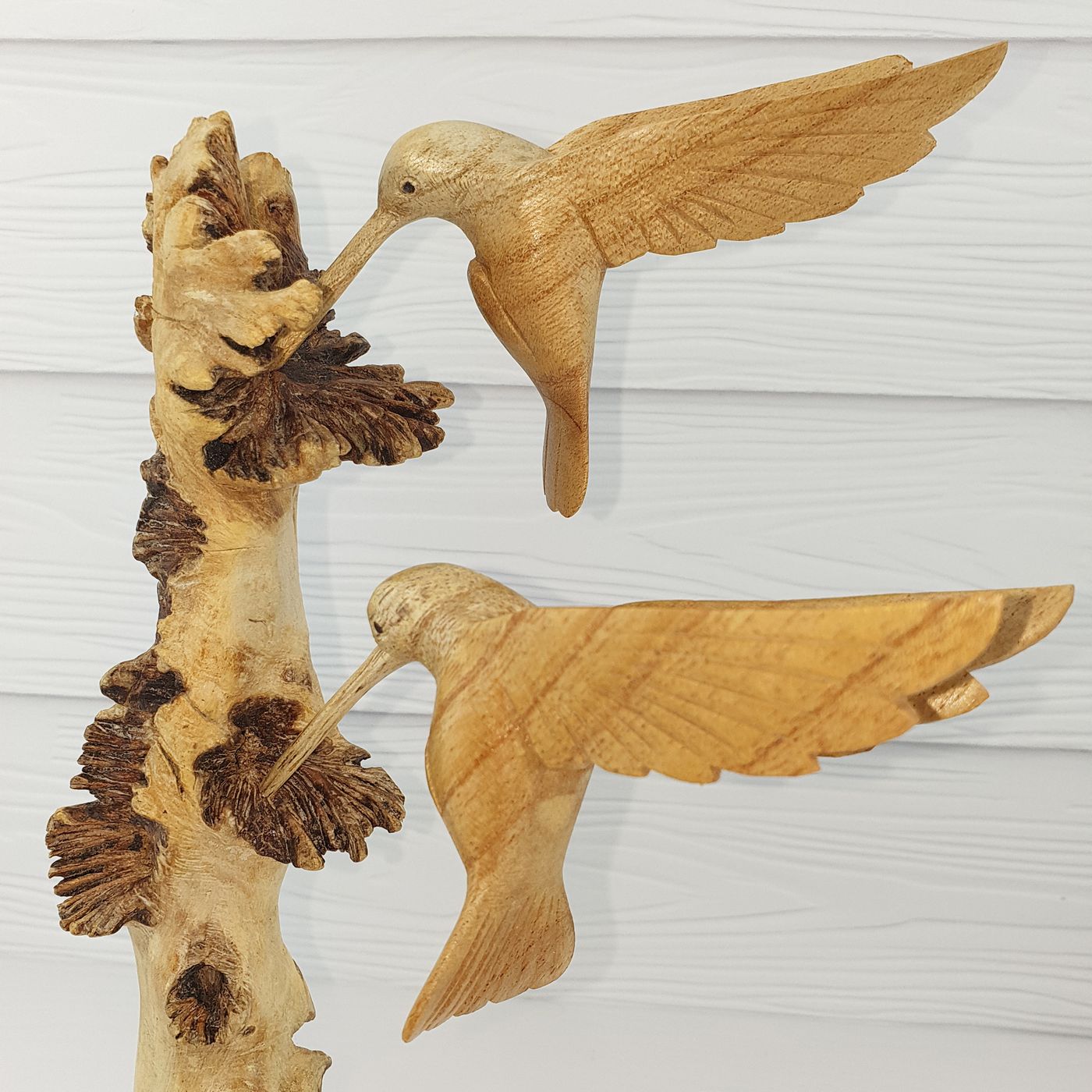 Mit einer Höhe von 26 cm und einer Breite von 17 cm setzt die Figur elegante Akzente in jedem Raum. Die detailreich geschnitzten Kolibris (je ca. 15 cm lang, 4 cm breit) zeigen eindrucksvolle Holzschnitzerei und betonen die warme, natürliche Holzmaserung.