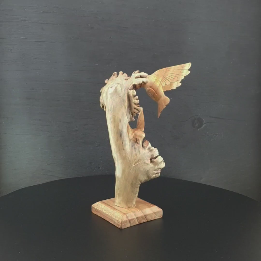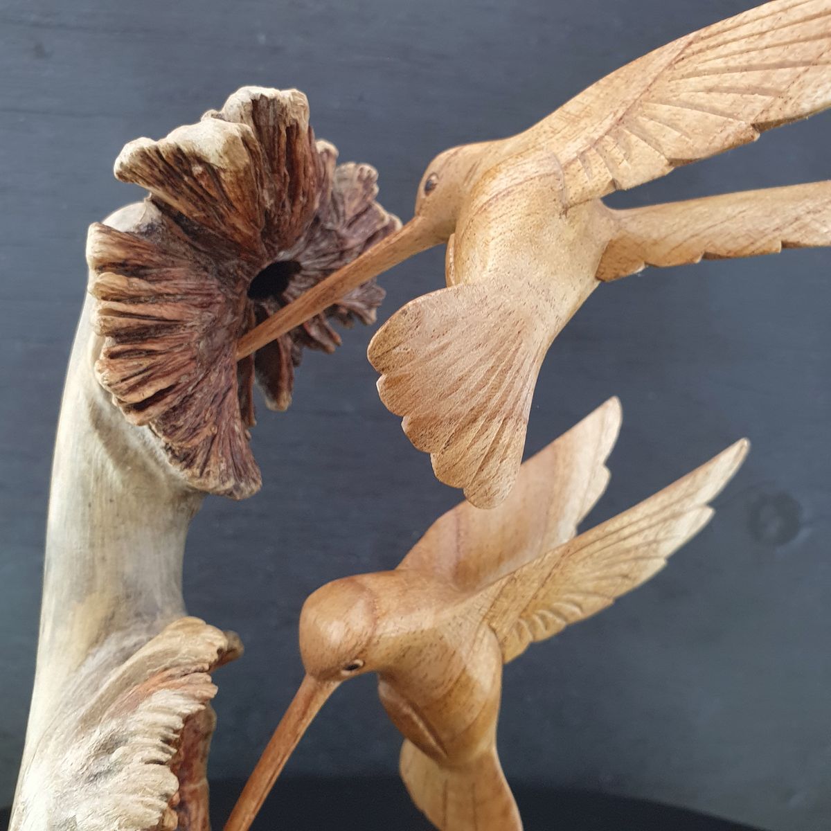 Mit einer Höhe von 20 cm und einer Breite von 19 cm setzt die Figur elegante Akzente in jedem Raum. Die detailreich geschnitzten Kolibris (je ca. 15 cm lang, 4 cm breit) zeigen eindrucksvolle Holzschnitzerei und betonen die warme, natürliche Holzmaserung.