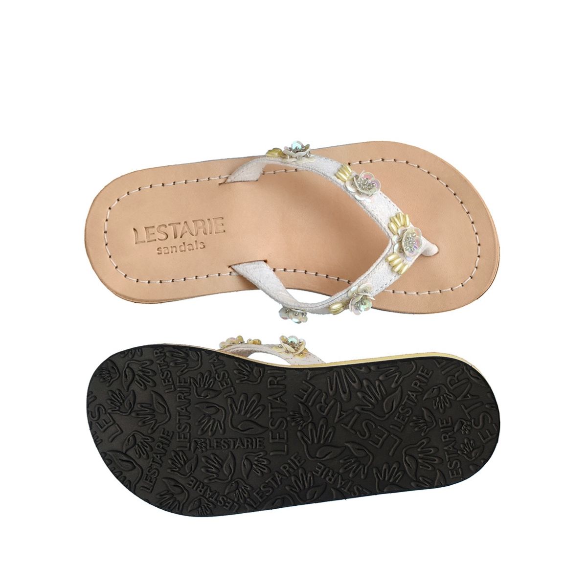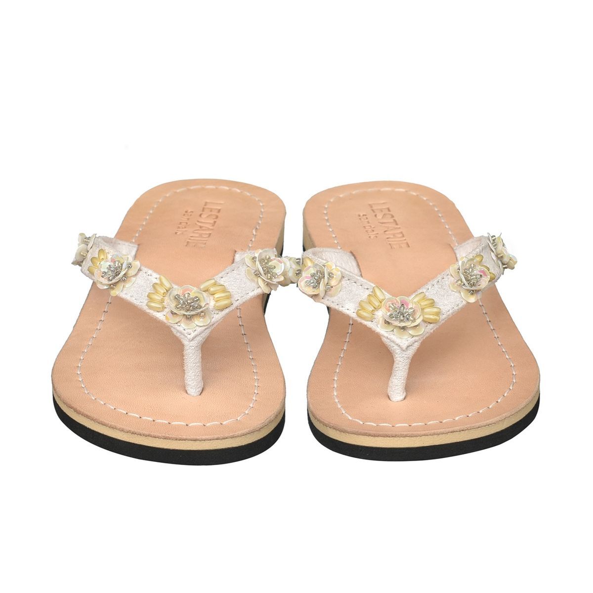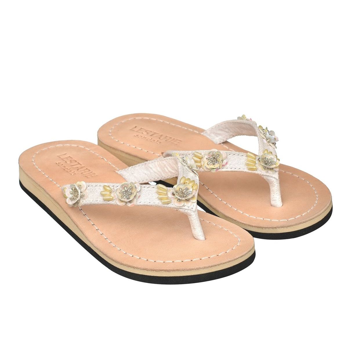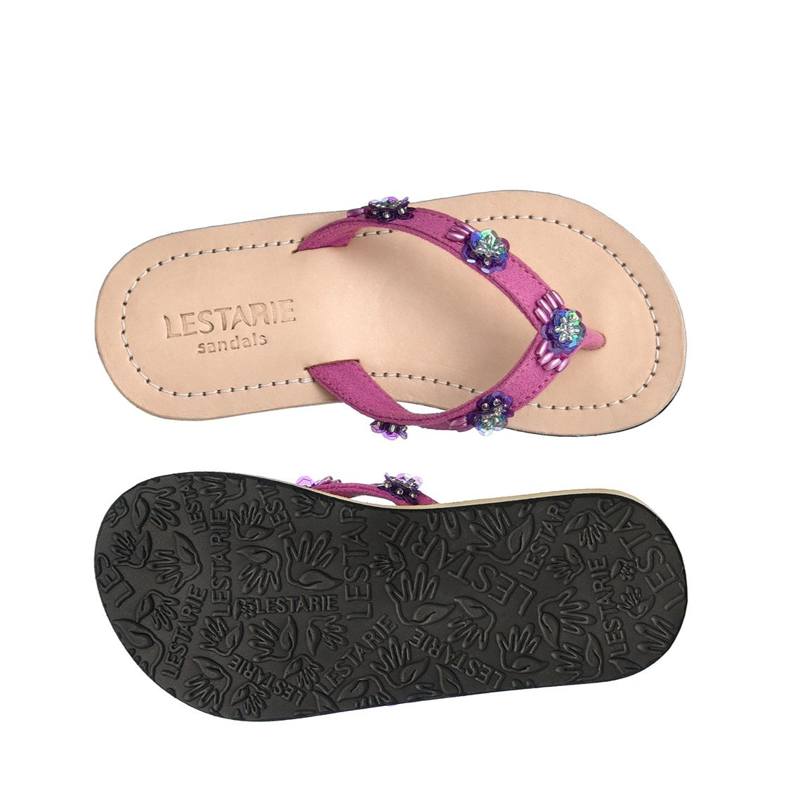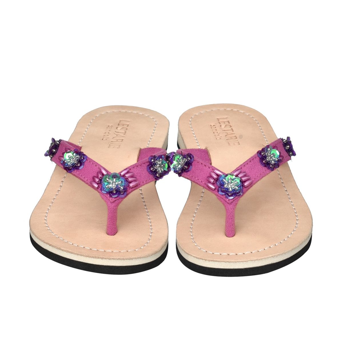 Diese liebevoll handgefertigten Mädchen Flipflops aus weichem Echtleder bieten höchsten Tragekomfort und versprühen mit ihren funkelnden Pailletten im Blumenmotiv pure Sommerlaune.