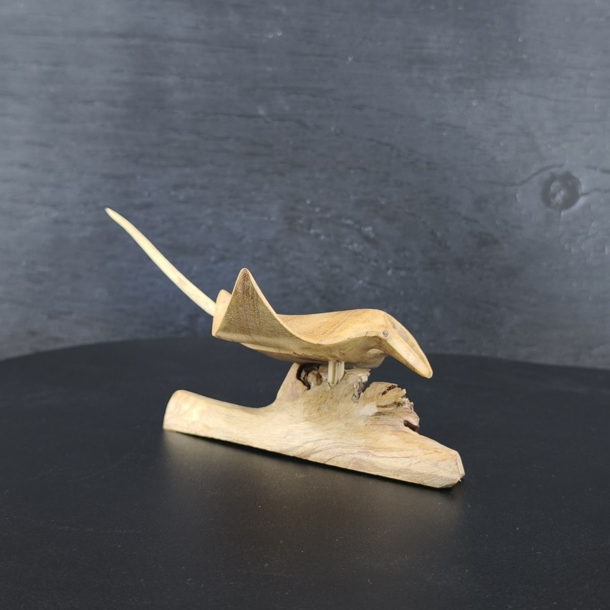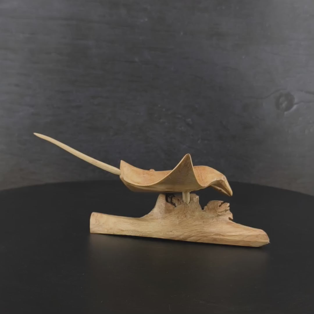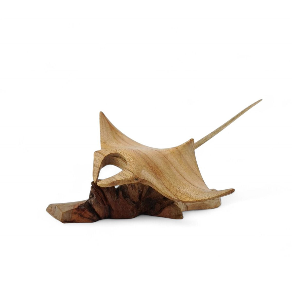 Tauche ein in die Welt des Meeres: Dein handgefertigter Holz-Manta-Rochen wird aus edlem Jempinis-Holz geschnitzt und auf einem Sockel aus Parasit-Holz präsentiert.