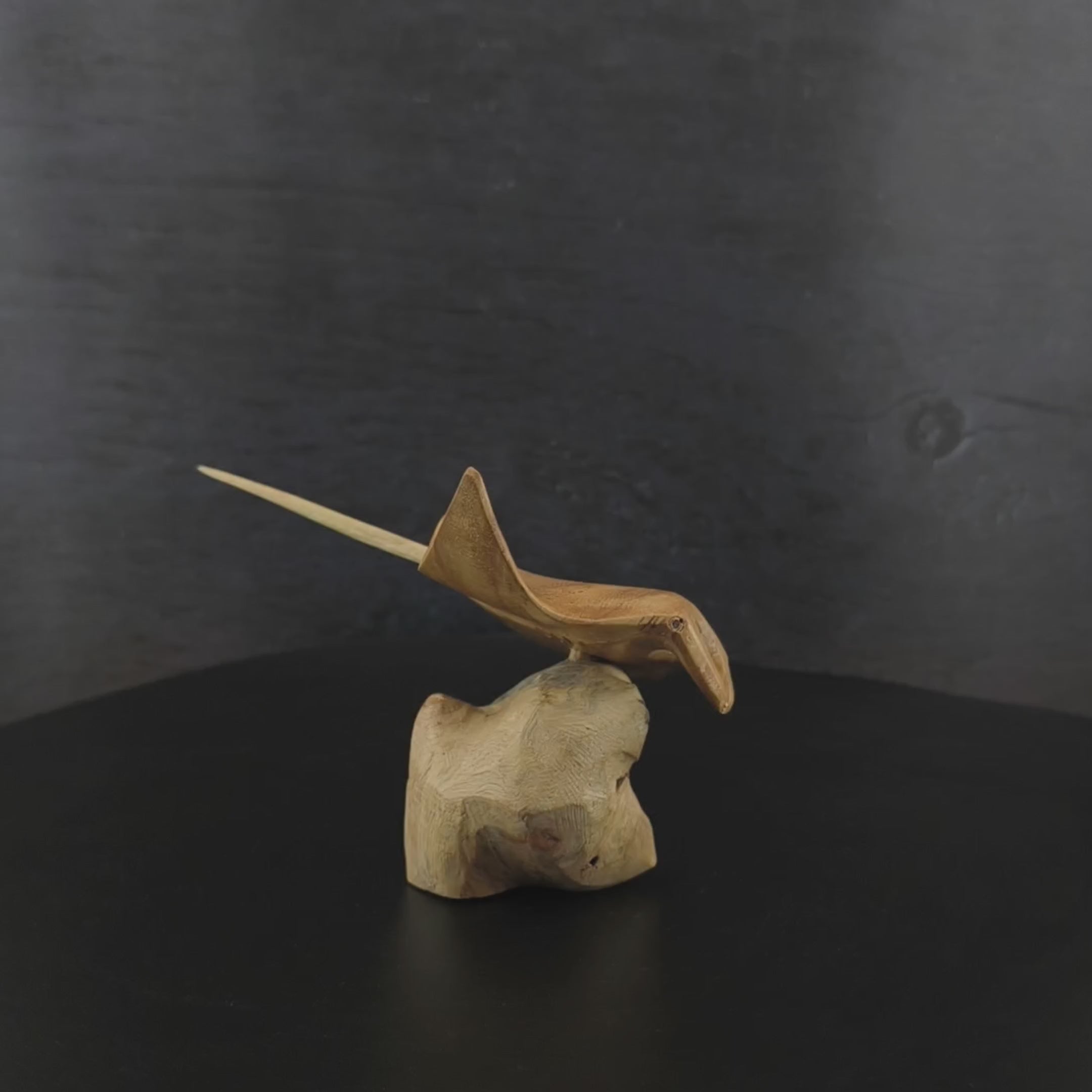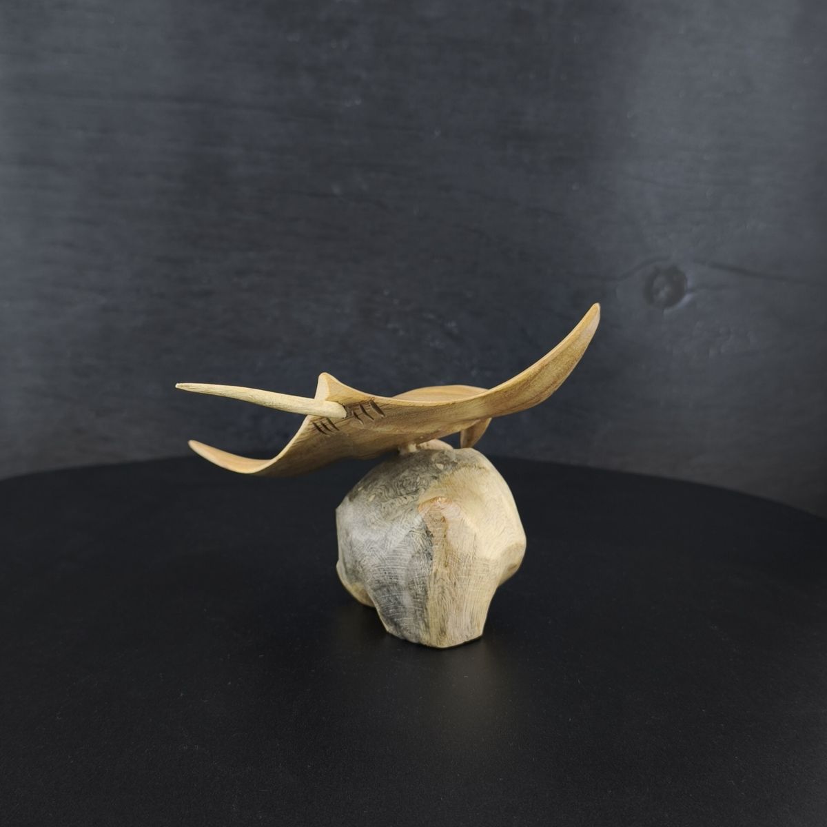 Tauche ein in die Welt des Meeres: Dein handgefertigter Holz-Manta-Rochen wird aus edlem Jempinis-Holz geschnitzt und auf einem Sockel aus Parasit-Holz präsentiert.