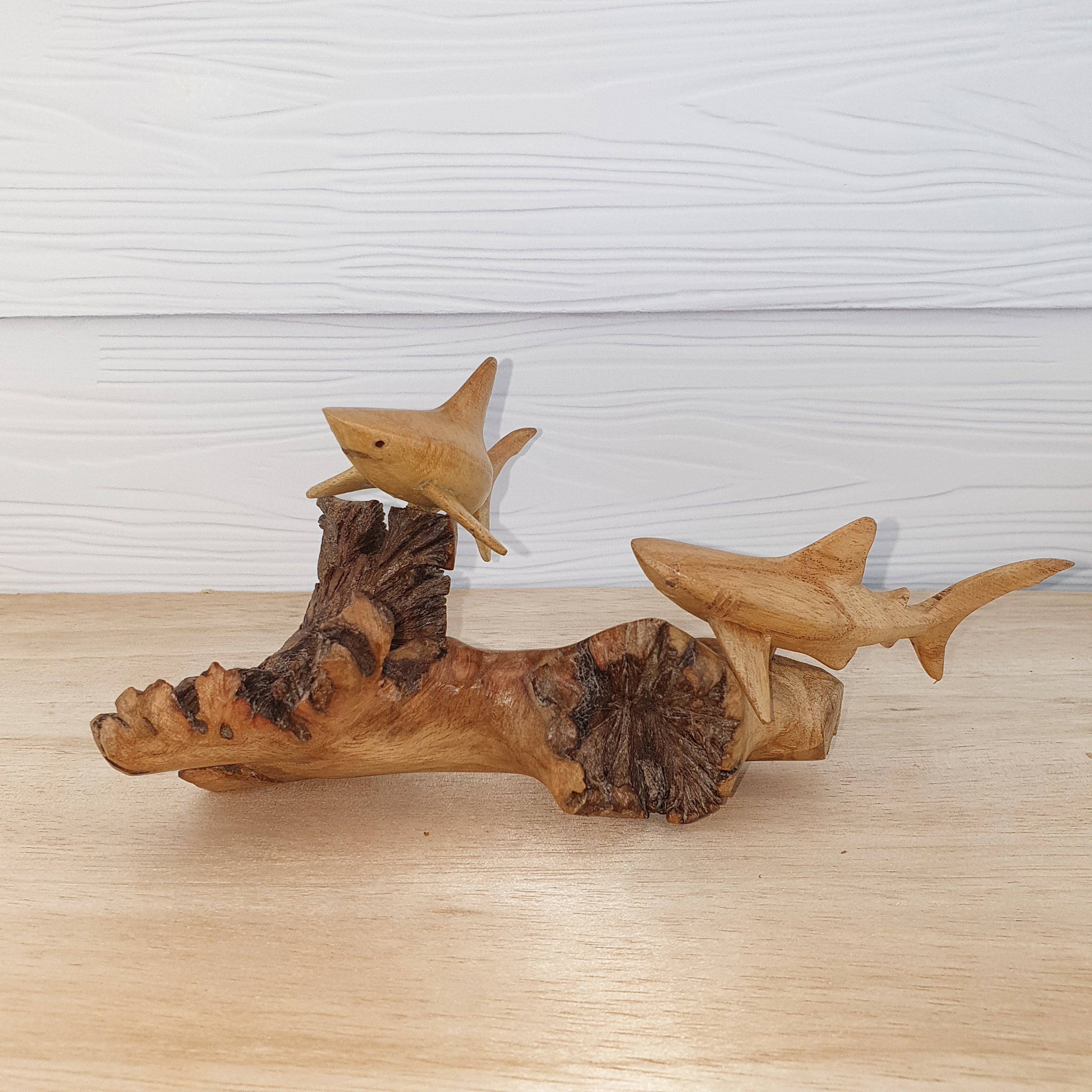 Diese kunstvoll handgeschnitzten Riffhaie sind ein echtes Unikat für alle, die das Meer lieben.