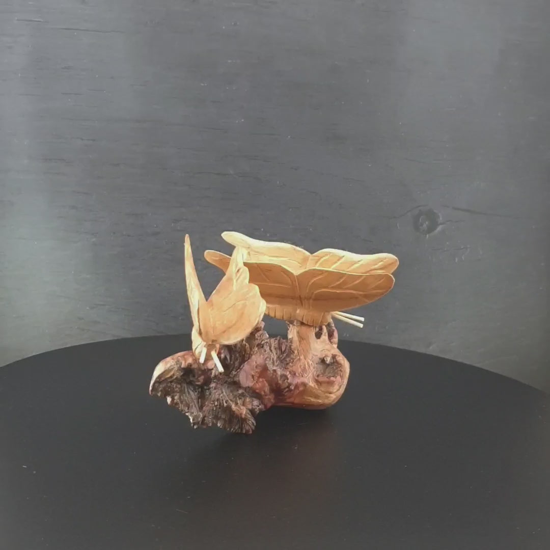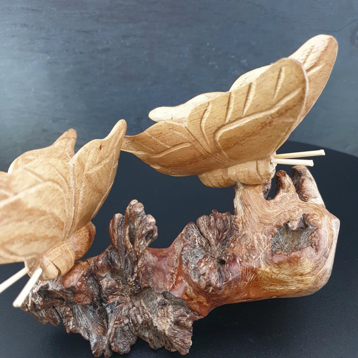 Diese beiden handgeschnitzten Schmetterlinge aus edlem Jempinis-Holz stehen sicher auf einem Sockel aus Parasitholz und sind echte Unikate.