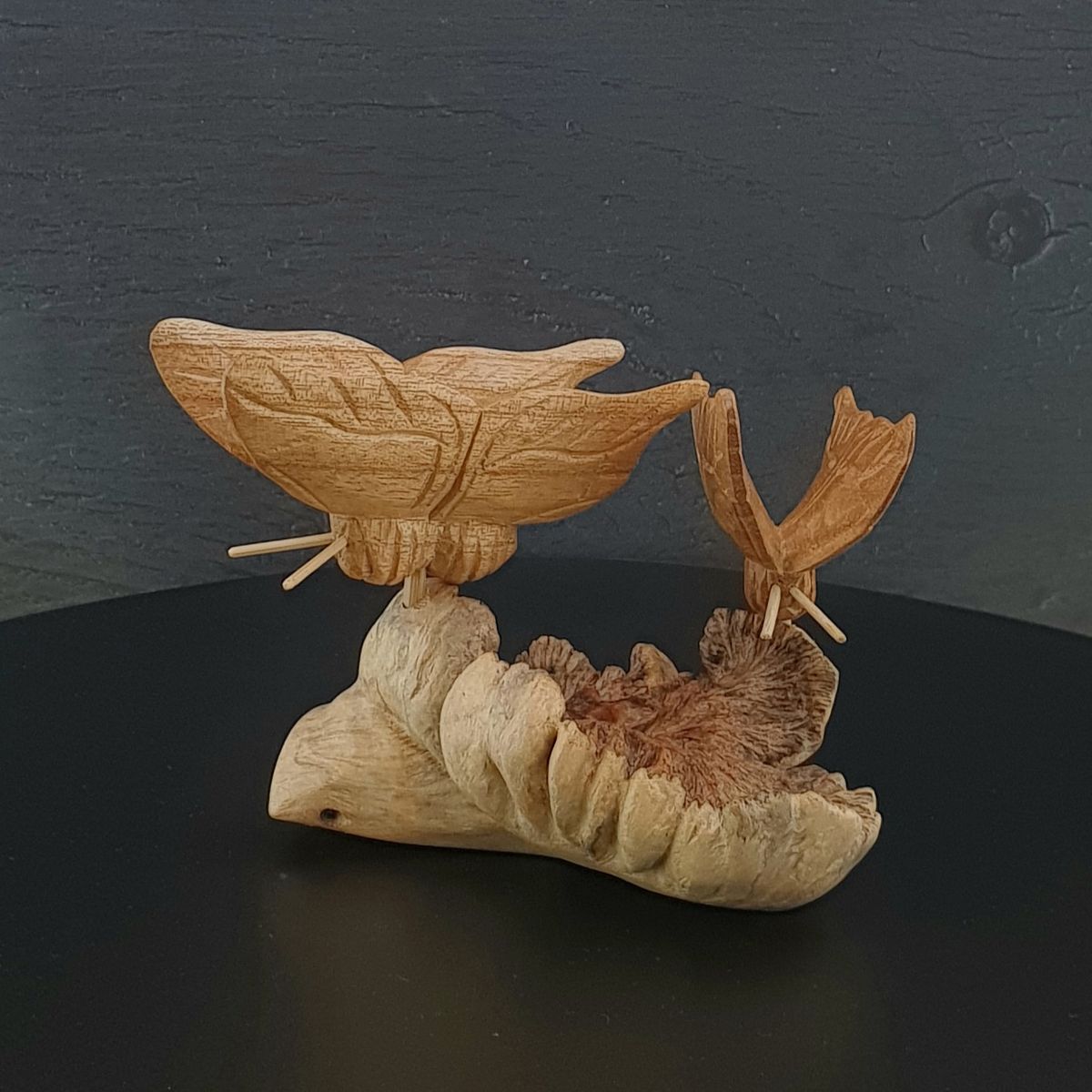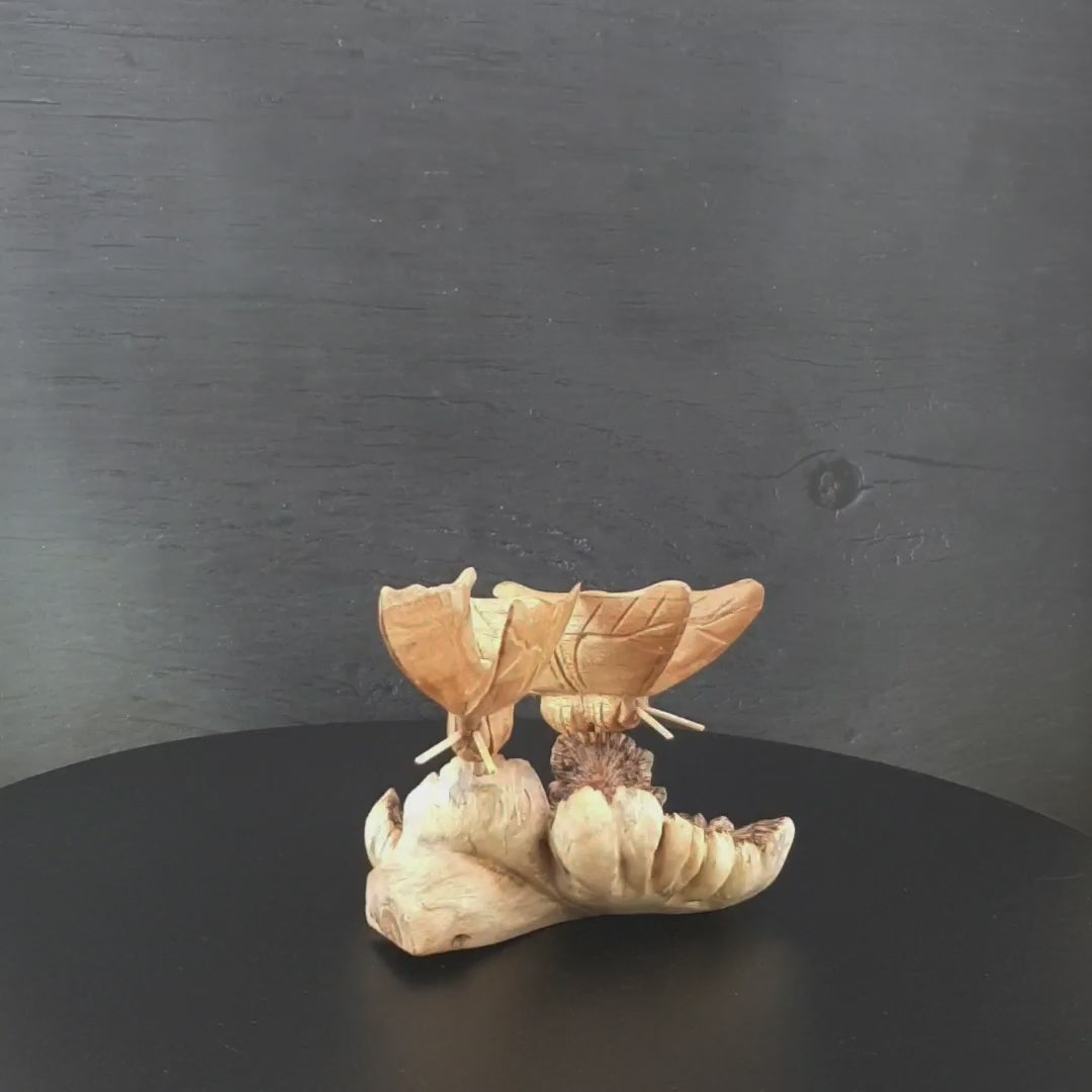 Diese beiden handgeschnitzten Schmetterlinge aus edlem Jempinis-Holz stehen sicher auf einem Sockel aus Parasitholz und sind echte Unikate.