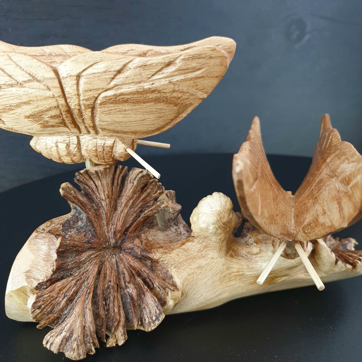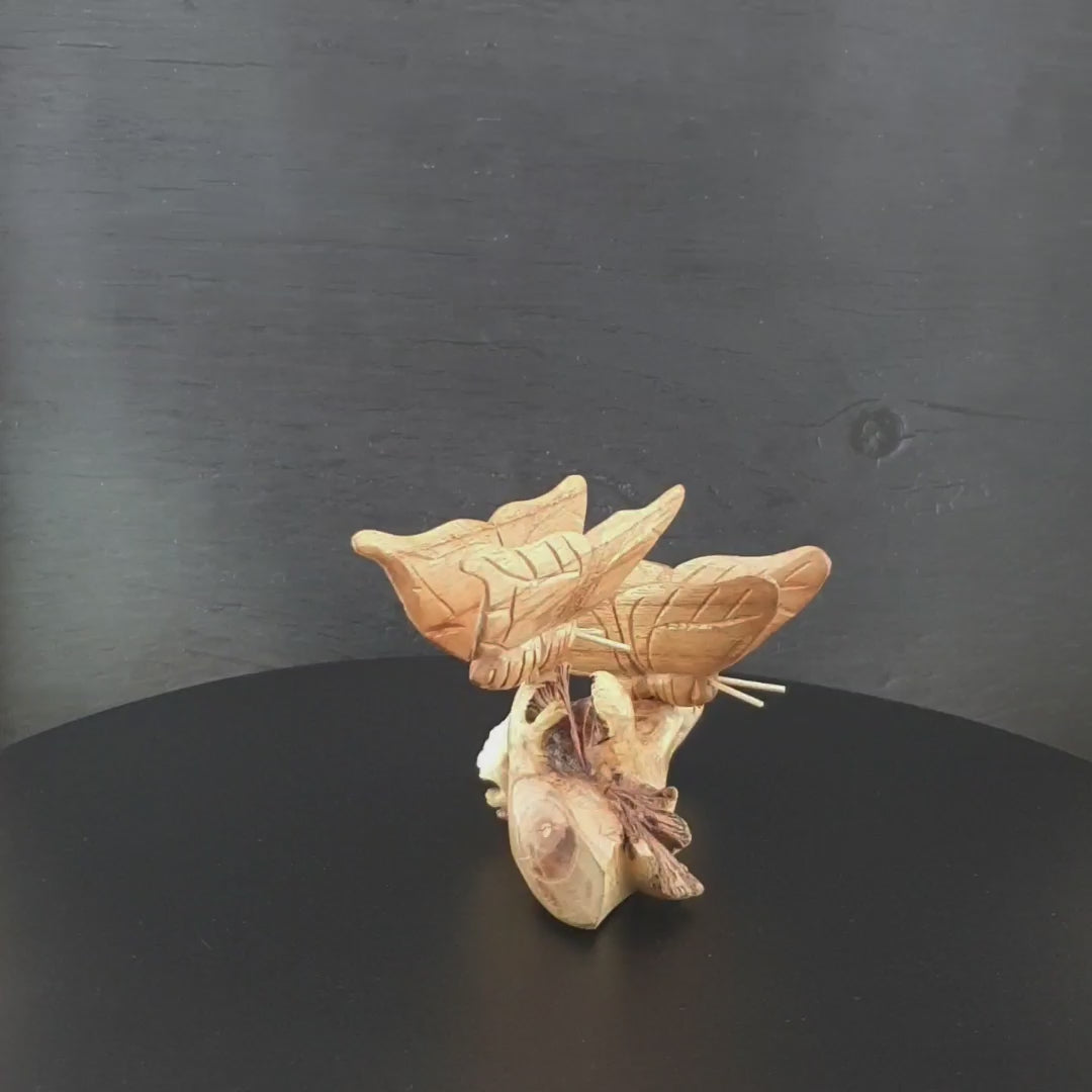Diese beiden handgeschnitzten Schmetterlinge aus edlem Jempinis-Holz stehen sicher auf einem Sockel aus Parasitholz und sind echte Unikate.